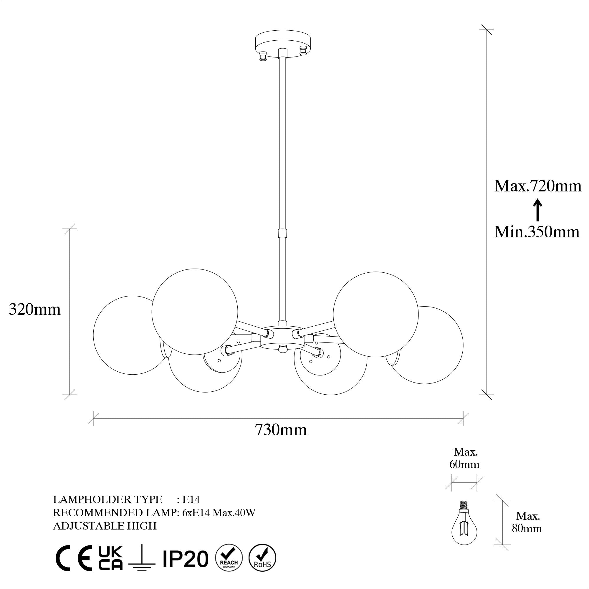 Belysta ditt utrymme med det mjuka skenet från vår Vintage Krona, och skapa en mysig och inbjudande atmosfär för dig och dina gäster att njuta av. Den justerbara höjden gör att du kan anpassa utseendet så att det passar ditt utrymme perfekt, medan de sex E14-socklarna ger tillräcklig belysning för alla tillfällen.
