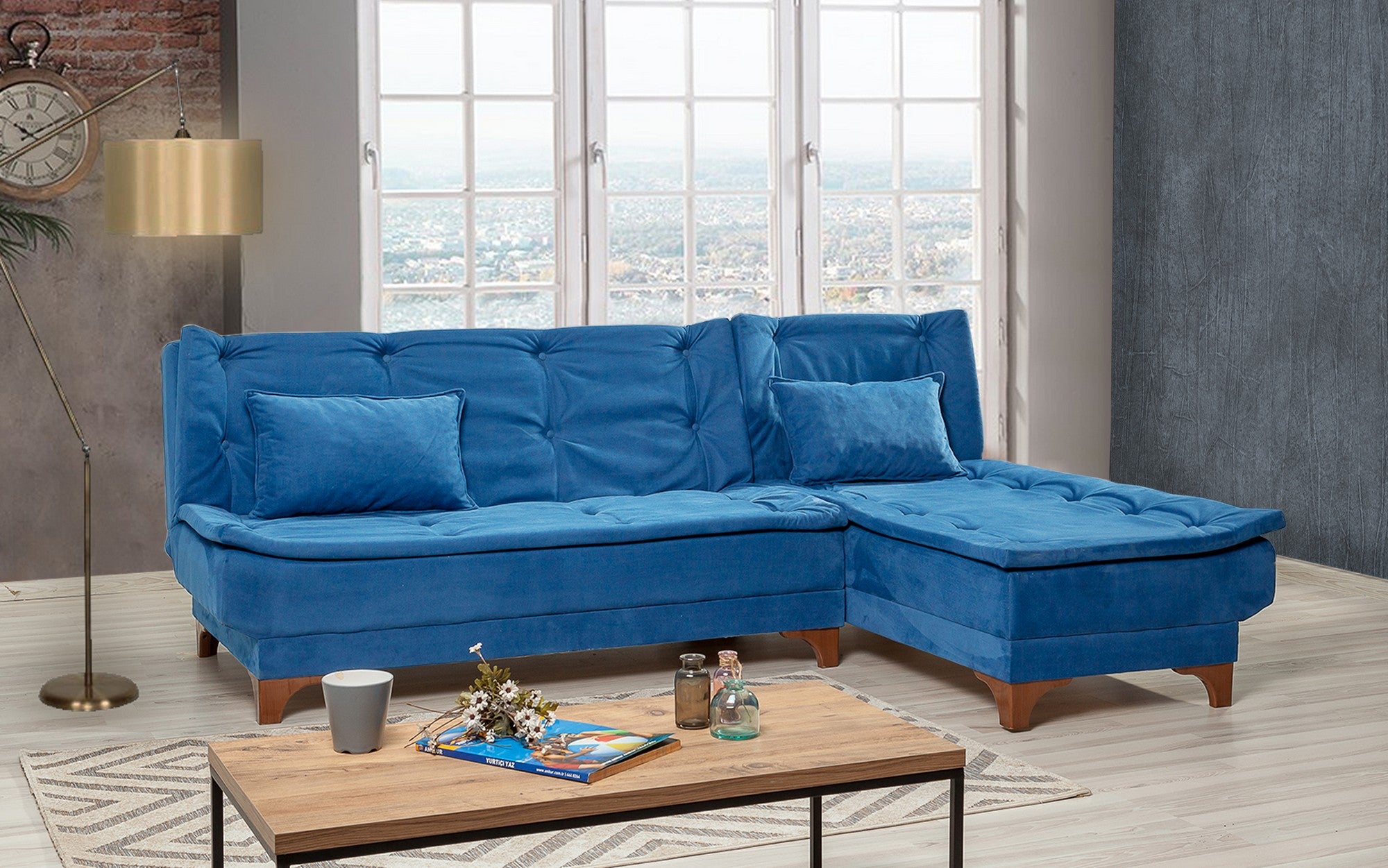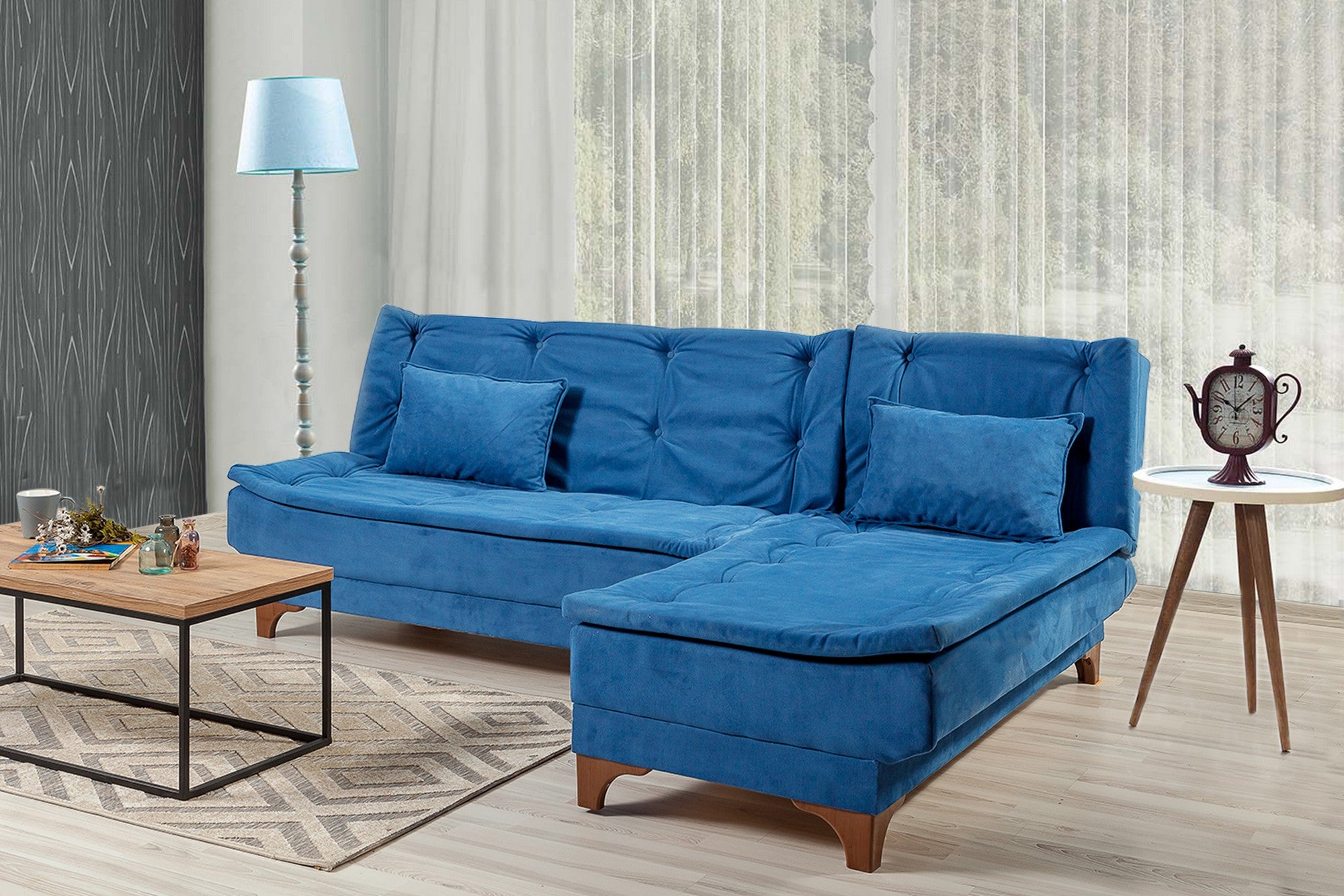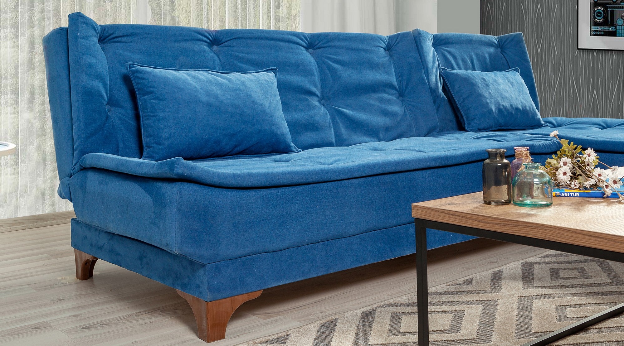 Transformera ditt vardagsrum med vår fantastiska mörkblå hörnsoffa-säng. Denna mångsidiga möbel är inte bara en soffa, utan också en bekväm säng för dina gäster. Den djupa blå färgen ger en känsla av sofistikering och nostalgi till din heminredning, vilket skapar en varm och inbjudande atmosfär.