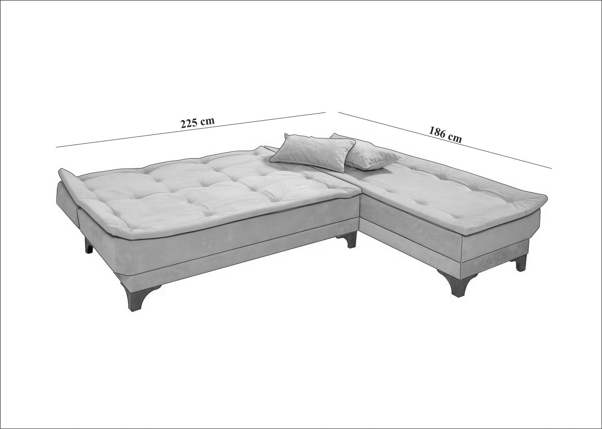 Med sin kompakta design är denna hörnsoffa-säng idealisk för små bostadsutrymmen. Sängstorleken på 225 cm x 186 cm ger gott om sovutrymme för dina gäster, medan soffans mått på 225 cm x 86 cm x 160 cm erbjuder gott om sittplats för din familj och vänner.