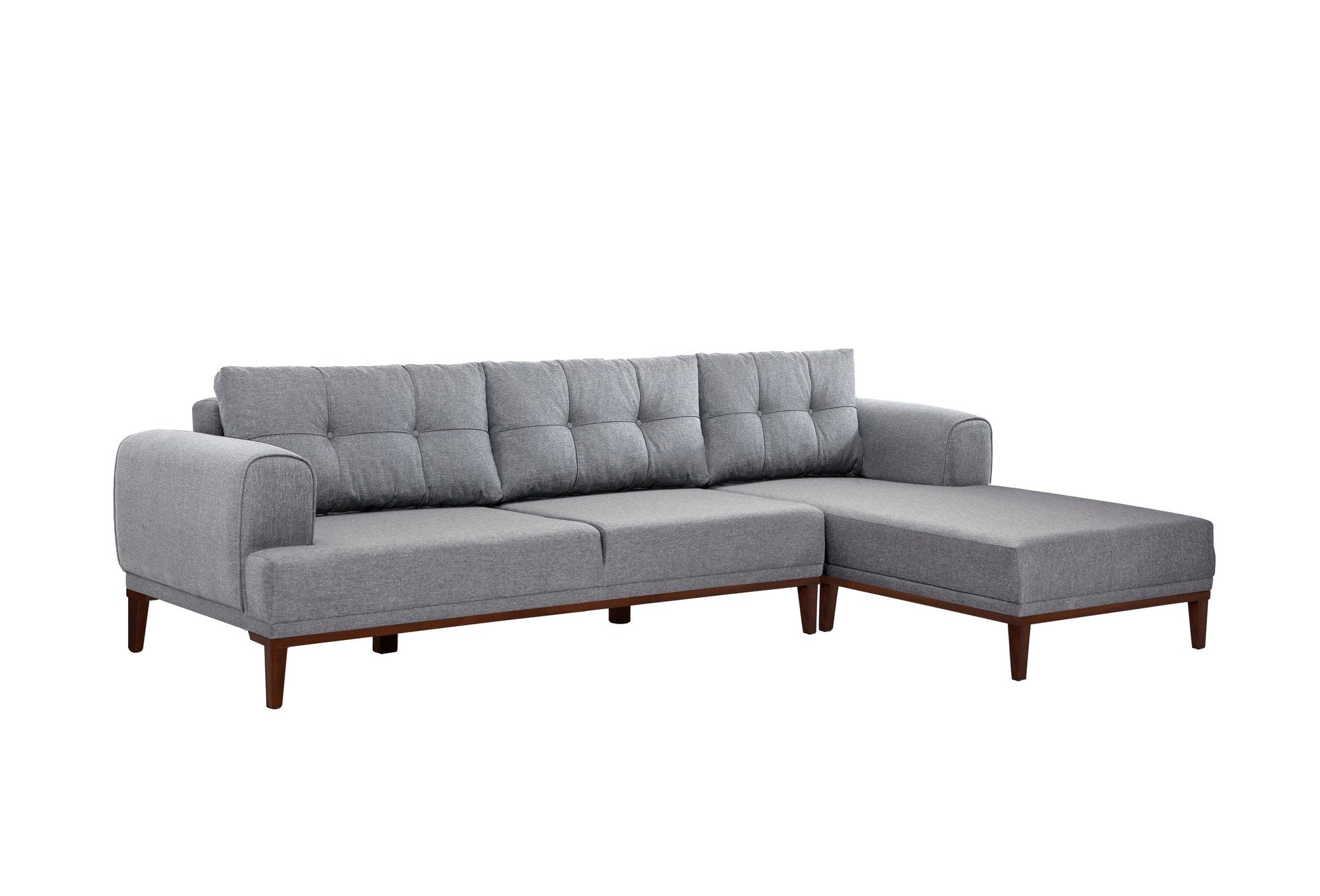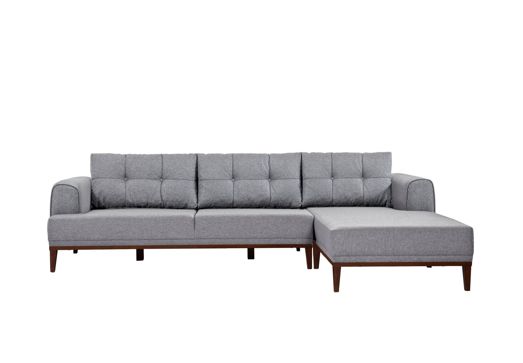 Den eleganta kombinationen av grå och valnötsfärger, tillsammans med de eleganta träbenen, ger vardagsrummet en sofistikerad touch. De rena linjerna och den moderna designen gör denna soffa till en mångsidig möbel som passar alla inredningsstilar.