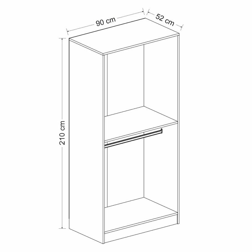 Med en bredd på 90 cm, höjd på 210 cm och djup på 52 cm erbjuder denna garderob generöst med förvaringsutrymme för alla dina kläder och accessoarer. Säg adjö till röran och omfamna ett välorganiserat och städat sovrum.